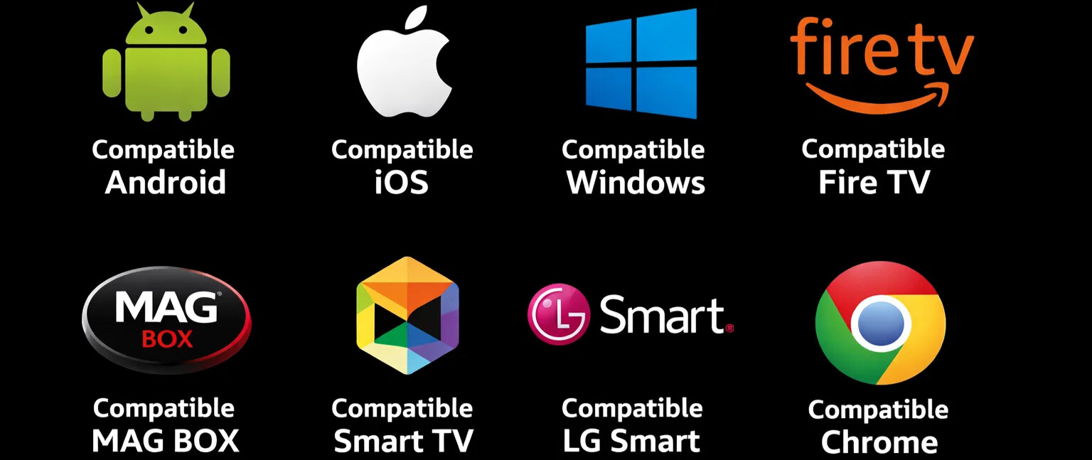 Notre service est compatible avec tous les appareils : Smart TV (Samsung, LG), Android TV Box, smartphones et tablettes (iOS/Android), PC/Mac, MAG Box, Fire Stick et bien plus encore.
